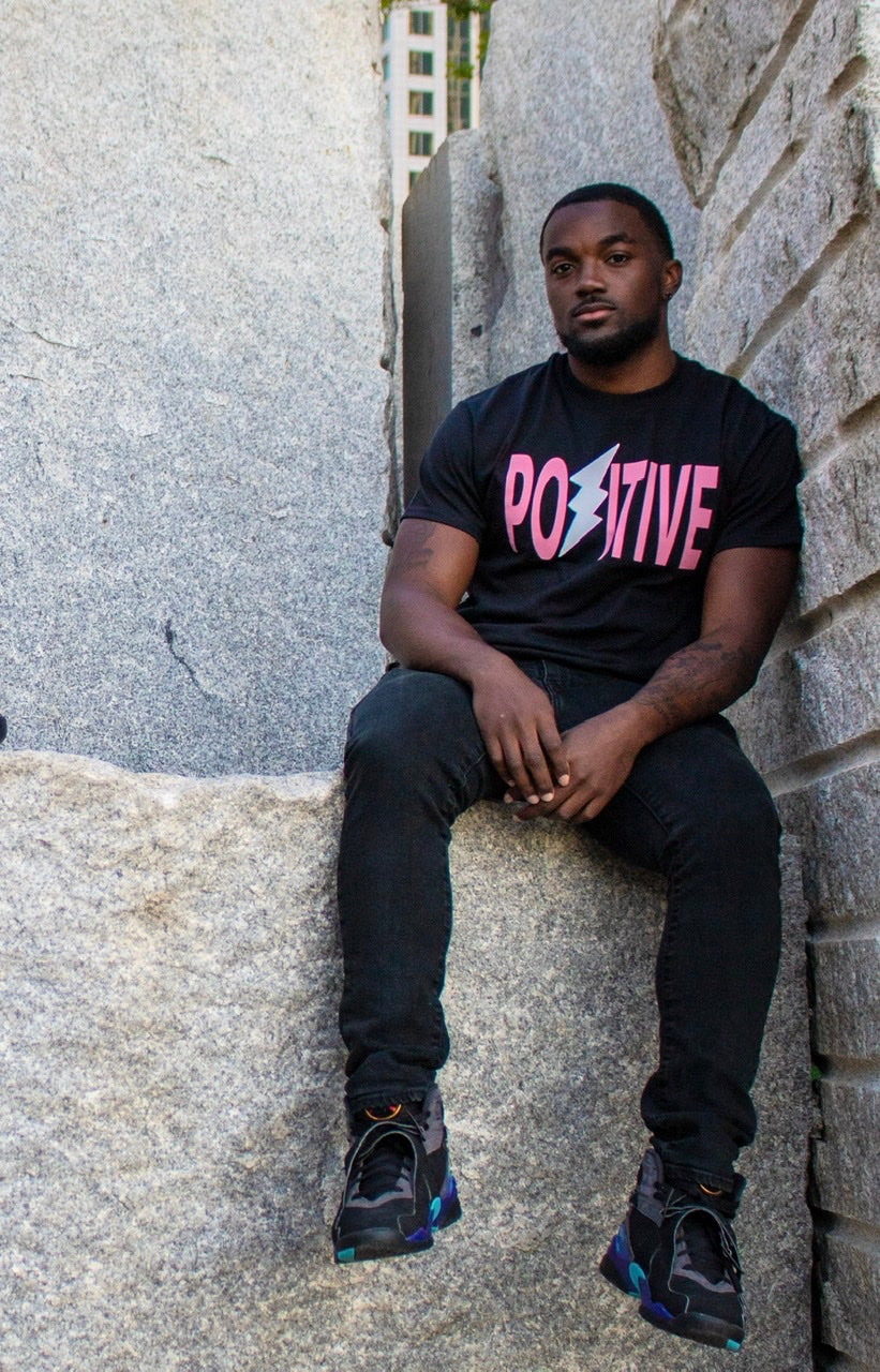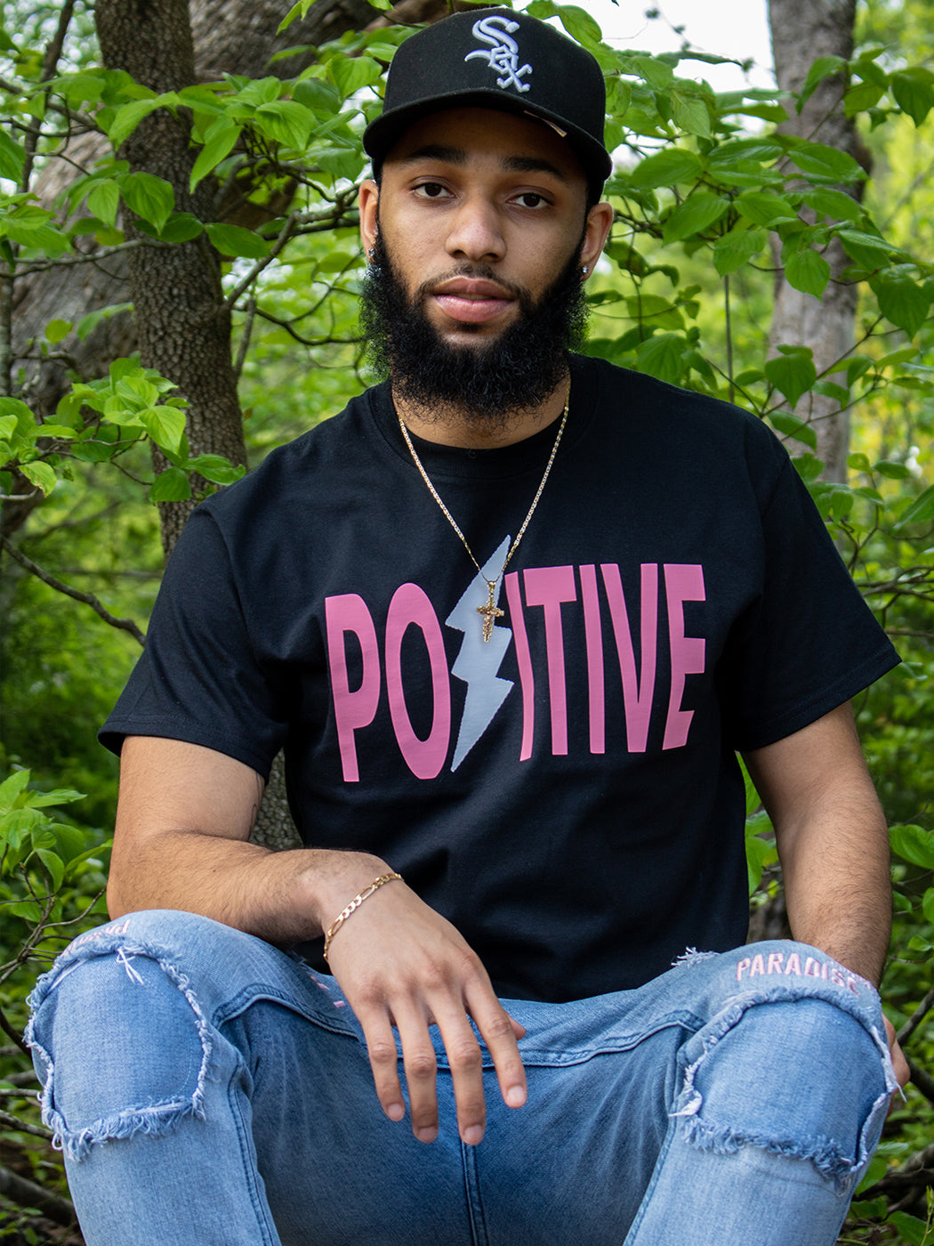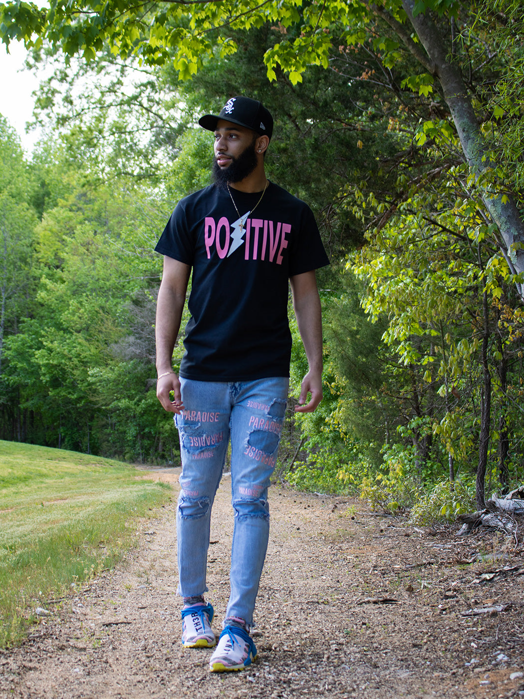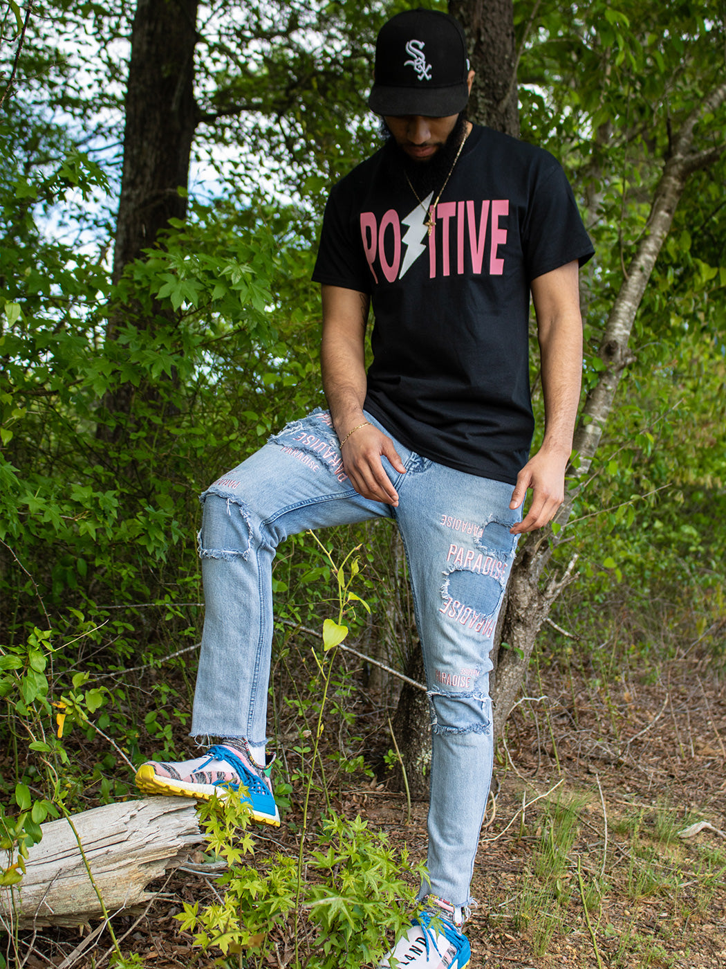 The Black Positive Tee is considered essential in black cotton with contrasting pink print. Sporting a rounded neckline and confident color combo, this tee is the perfect addition to your off-duty rotation.