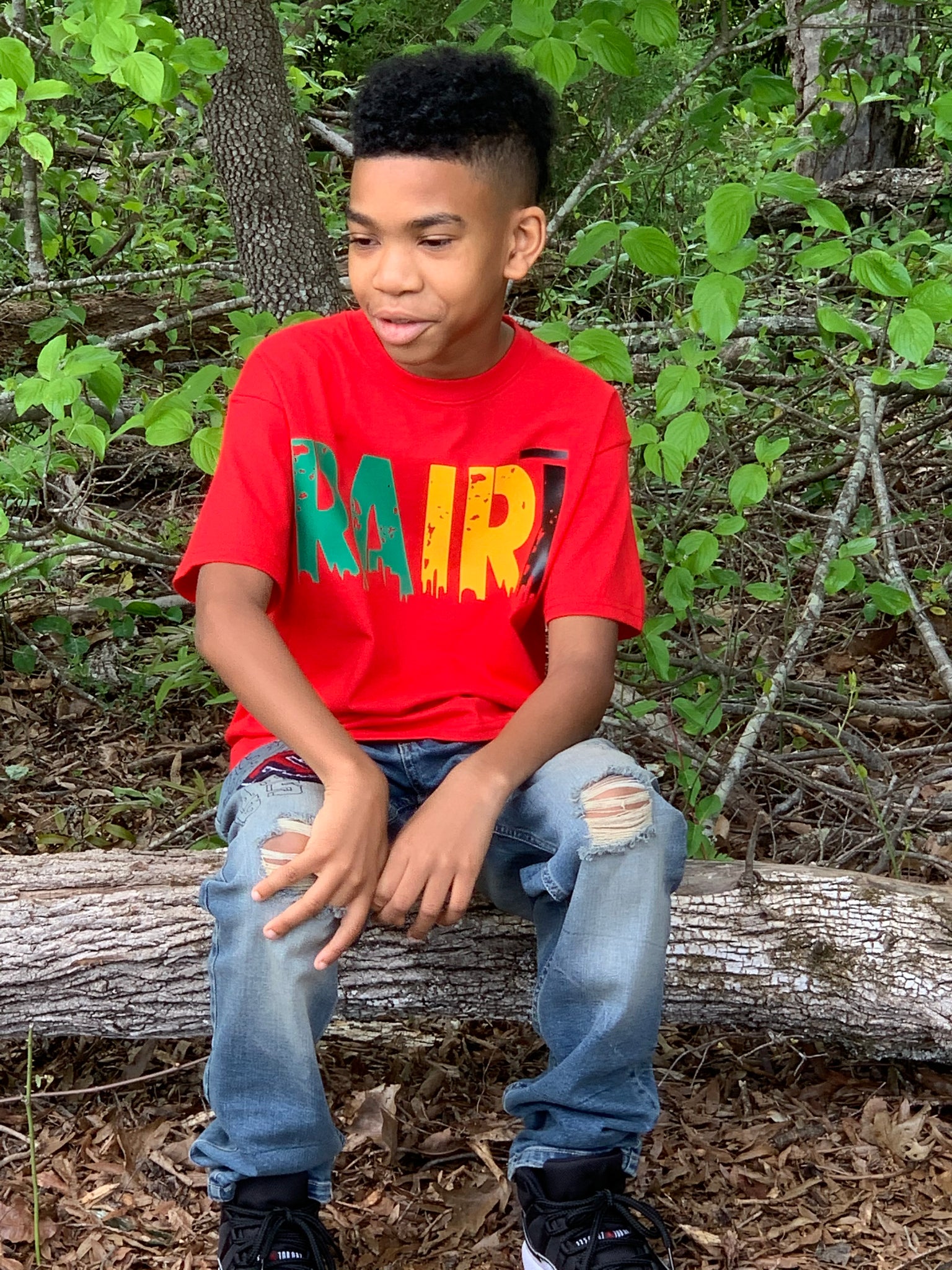 This summertime staple will work for all looks. With a rounded neckline, fun red color, and green, yellow and black print this tee will look great everywhere he wants to go.